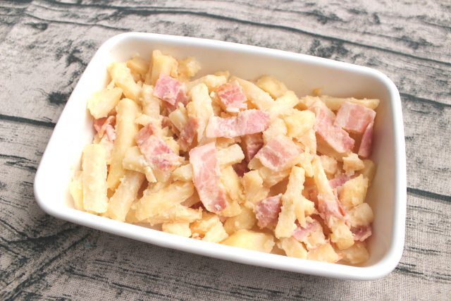 ベーコンのうまみでお芋がたくさん食べられるやみつきおかずです。冷めても美味しく、スティック状なのでお弁当に入れやすいです。コンソメが無い場合は、塩こしょうでも大丈夫です。
