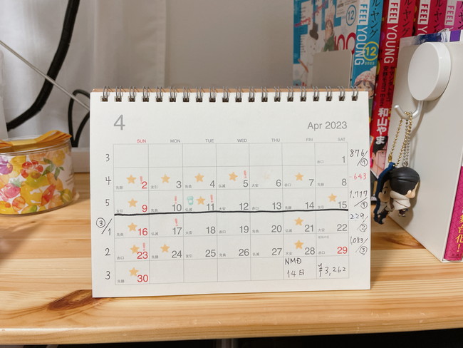 Money money 2023年4月の振り返り Money 2023年05月16日(火) 21時00分 【はじめに】【一人暮らし】【5週間やりくり】【現在の家計簿】 毎日恒例、4月の振り返りです トータルノーマネーディは14日でした ノルマ不達成…😇 週予算の残り目標は2,500円に対して3,262円 こちらはノルマ達成~🎉🥳 赤字1回あるけどそれ以降黒字なのでOK~ 予算も結構余ったから2月と3月の赤字取り返せた感じかな?? ⭐・・・ノーマネーディ /・・・筋トレ ☕️・・・ストレッチ 〇・・・お湯張り ❗・・・全身保湿 何も言えねぇ~😵